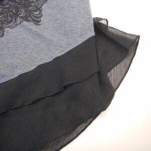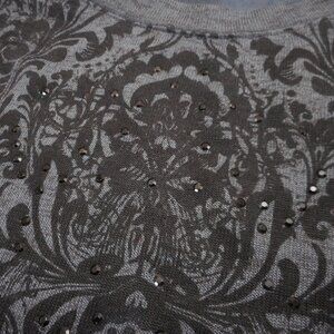 Features: Stretch knit tunic top with sheer trim, long ruched sleeves, gothic floral print on the front with some small rhinestone sparkle