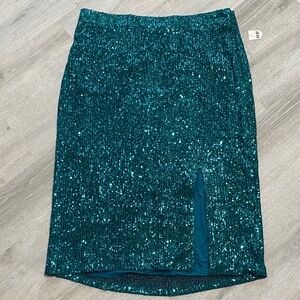 Brand new with tags! Maeve Anthropologie aqua sequin midi skirt with a slit. Plus size 1X measures about an 18.5 inch waist laying flat, 31 inches long, 12 inch slit.