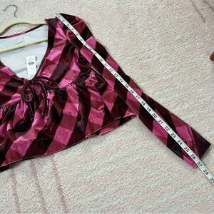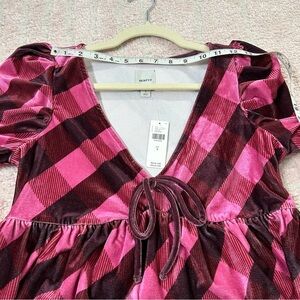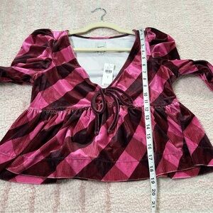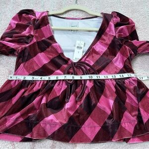 NWT Maeve Velvet Pink and Maroon Plaid Puff Sleeve Top Low Cut Size Small