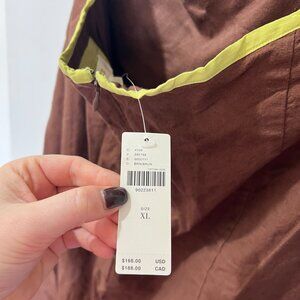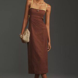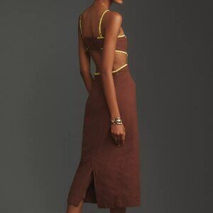 Make a statement in this stunning Maeve by Anthropologie midi dress! With a sleek brown hue and striking chartreuse contrast trim, this dress is both elegant and edgy—perfect for a night out, summer event, or vacation vibes! ☀️🌴