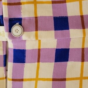 Bold and colorful plaid print pants in a petite cropped length. Flared or boot cut leg opening
