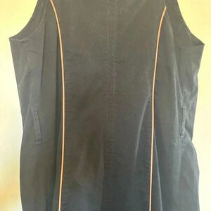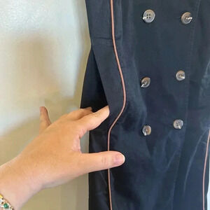 Tench style midi dress. Tank with buckles to adjust straps. Pockets on either side. Button down front. Black dress with brown piping. Collar. Slits on the sides. Belt loops. Dress does not come with a belt. Looks great without it or would be great with a belt. Has a sophisticated feel about it.