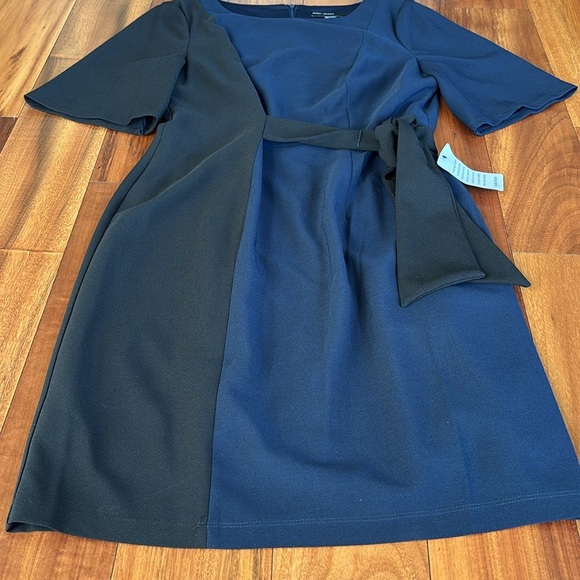 Beautiful and flattering navy and black front tie dress. Zips in back. Fully lined with short sleeves. NWT