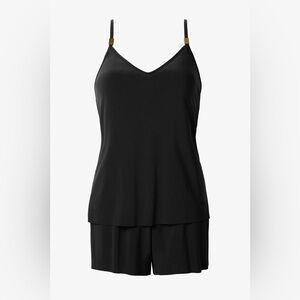 Indulge in the luxurious comfort of the Magicsuit Black Pajama Set, featuring a soft camisole with adjustable spaghetti straps and a relaxed V-neckline. The matching shorts offer a loose fit for ultimate relaxation, making this set perfect for a cozy night's sleep or lounging at home.