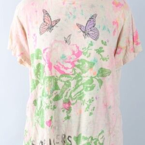 A unique basic, this soft cotton tee has a relaxed boyfriend fit and a well loved look. It has raw edges at the round neckline, short sleeves, a spacious hemline, and intentional holes near the shoulders. Softly watercolored with roses, hearts and butterflies and the Mag Pearl Cupid logo in back.