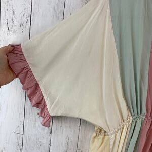 Colorblock romper with ruffle accent sleeves. Waist drawstring tie, Keyhole back button closure. Wide loose fit, oversize fit, lots of tush area. Soft fabric. Shorts lined. Such a cutie! Dressy enough for a picnic, beach or garden party. Lined