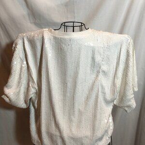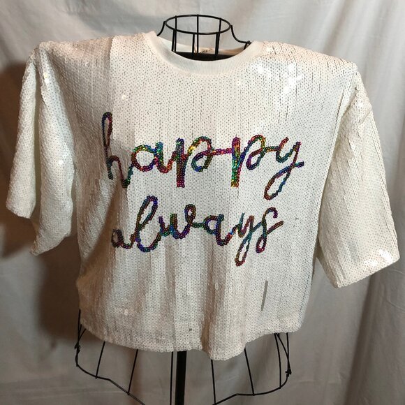 NWT Mainstray MEDIUM HAPPY ALWAYS White Sequin Crop Top 23.5" Pit to Pit