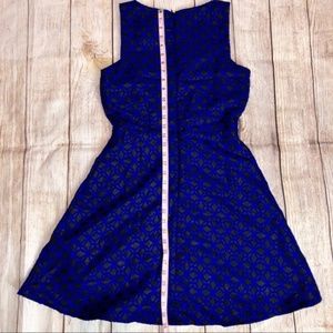 This dress is NWT. The blue is a vibrant royal blue and the black has a slight shimmer. The material is high quality. The dress features a back zipper. It is fully lined. Please see pics for measurements.
