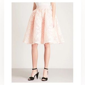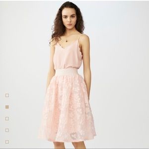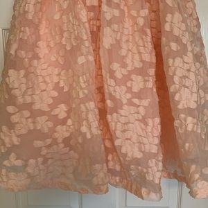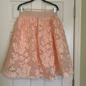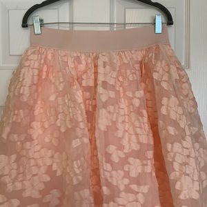Pink elastic waist skirt with full skirt that is layered, top layer is sheer with floral appliques. Great girly romantic skirt. Runs small IMO, there is stretch from the elastic waist but please see measurements. No flaws, brand new.