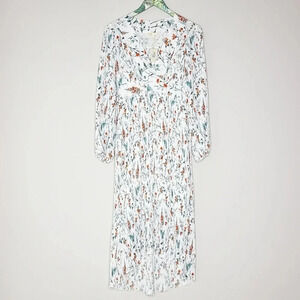 New with Tags Maje Rasiona white floral pleated crepe long sleeve midi dress. Cut with a slim fit and longline shape, it's pleated for an extra dose of flair and features long billowing sleeves with elasticized cuffs. V-neck. Empire waist. Side zip closure.