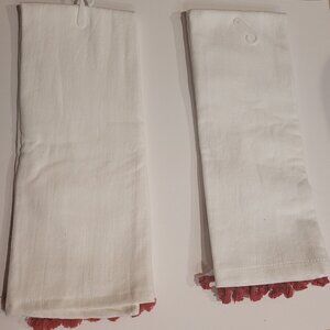 New, never used. No stains or snags. Kept in a sealed container. Smoke-free, pet-free home. White with red fringe. 16 in wide and 28 in long. You get 2 towels. Purchased from Joann's. Makes a great gift for any gnome lover.