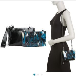 This sleek and sophisticated faux leather convertible wristlet/shoulder bag is perfect for every occasion. Two pouch wristlet, one large with interior pocket measures 5.5 " x 8.1" in solid black and one small measuring 4.25'' X 7'' X 1'' in psychedelic pattern of black white and blue can be used separately or keep together and use with long 22' drop shoulder strap. Chrome/silver hardware and dark colors make this the perfect fit for that 'little black dress' in your closet or as an stylish accessory for work or with jeans.