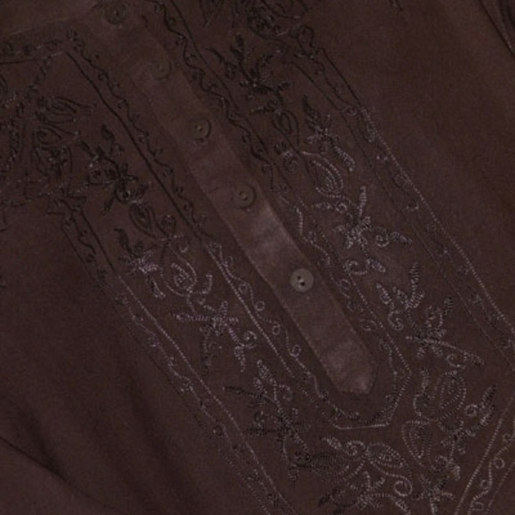From Karma Highway this is a midweight (no see-thru but not heavy-heavy) rayon Mandarin collar yoga tunic. Embroidered front, sleeve bottoms and hem along with slit sides. It has a short button placket with fancy embroidery. Dark sort of a bittersweet brown.