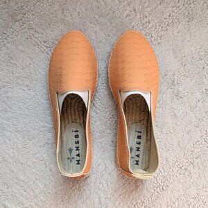This pair of NWT Manebi Amazonia Embossed Leather Espadrilles in Pastel Rose is in its original condition. Very soft embossed genuine leather upper, braided jute footbed and platform, slip on, round toe, rubber sole. Designed in Italy, made in Spain. Very comfortable to wear and runs true to size. Comes with its original shoe box.