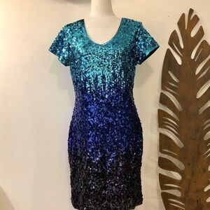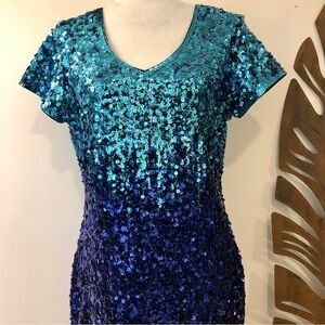Gorgeous and fun! This sequin dress has three different colors of sequins that seemingly fade into each other. Pull on styling with lots of stretch. Fully lined. V neck in front and back. Perfect for a fun formal, club, cocktail party, carnival, ball, bachelorette or whatever you can think of!