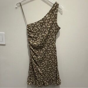 Step out in style with this elegant brown floral one-shoulder dress. Perfect for any occasion, this dress features a chic design that flatters your silhouette. The subtle floral pattern adds a touch of femininity.