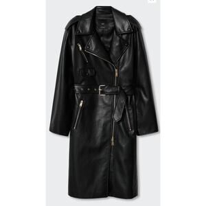 NWT Mango Faux Leather Trench Coat Black Belted Moto Style Long Jacket Size M