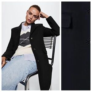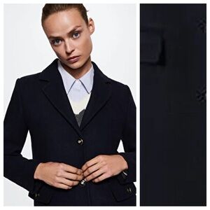 NWT. Mango Navy Blue Wool Blend Flowy Coat with lapel collar, long sleeves, front pockets with button closure, front buttons closure. Size XS. Ref. 37997737. Pit to pit 16,5" flat, shoulders 13", sleeves 24", length 34".