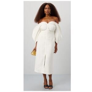 Mara Hoffman's 'Leonara' midi dress has a sculptural silhouette featuring an off-the-shoulder neckline and elegantly curved sleeves. It's made from a blend of TENCEL Lyocell and linen, so it feels soft and lightweight.