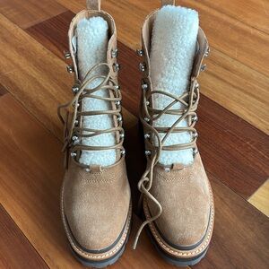 Plush genuine shearling lends cold-weather appeal to a trend-right, lace-up boot set atop a lugged sole for traction on wet or dry surfaces.