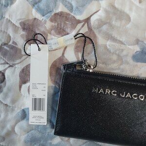 NWT Marc Jacobs Bi fold wallet Black Leather with Silver Hardware Multiple Card Slots 2 interior slip pockets zip pocket snap closure