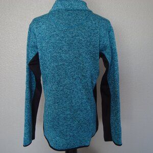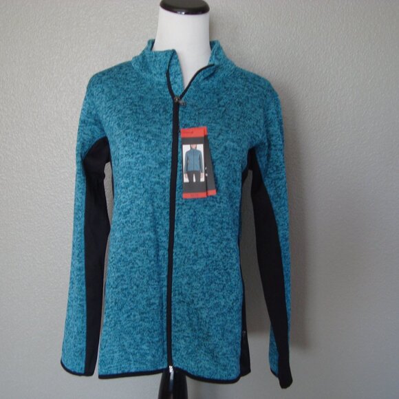 A nice new with tags full zip sweater jacket in a teal color with black accents on the sides for a slimming look. Size M