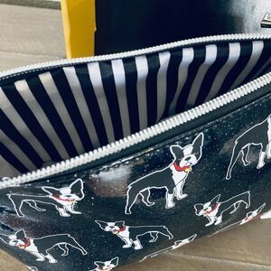 NWT Marc Tetro black and white shiny glitter finish 3-piece boxed travel gift set. Includes zippered cosmetic makeup or Toiletry storage bag / pouch, Folding passport wallet ID or credit card organizer case / cover, and small suitcase luggage ID tag. Adorable Boston Terrier dog graphic. Striped black and white interior, lightweight. Perfect for vacation, travel, work, or for school / supplies. See photo for measurements.
