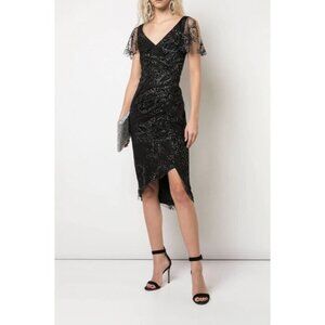 NWT Marchesa Notte Black Lace V-Neck Flocked Midi Dress $495