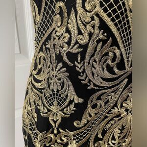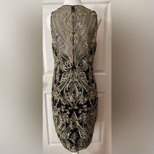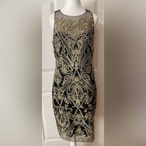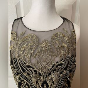 -features: Black and gold lace (60% Nylon, 40% Polyester). Sleeveless. Crew neckline. Sheath bodice. Hidden back zipper with hook-and-eye closure. Partially lined. Look eye-catching in this stunning gold sheath by Marchesa Notte. Wear it with strappy black sandals. NEW with Tags