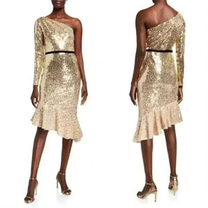 NWT Marchesa Notte Gold Sequin Ruffle Asymmetric One Shoulder Cocktail Dress 6