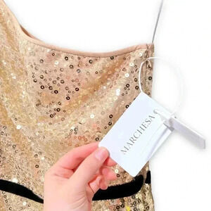The gorgeous Marchesa Notte Gold Sequin Ruffle Asymmetric Cocktail Dress is your next dress that is sure to make a statement. Be unforgettable at your next event, celebration, or evening out. Stunning ombre-patterned Champagne gold sequins cover this dress for an Intricate all-over shimmer. The design couldn't be more beautiful, as this dress is the ultimate statement of sophistication and elegance.