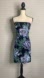 This dress is a striking strapless mini dress that combines elegance with a bold, botanical-inspired pattern. Deep navy Blue which serves as a dramatic canvas for the intricate floral design that covers the entire garment. Large, detailed blooms in shades of lavender, violet, and icy blue are interspersed with lush green leaves, creating a vivid, almost painterly effect that stands out beautiful the darker base. The dress has a structured silhouette that hugs the body, emphasizing the waist and creating a flattering, feminine shape. The bodice is fitted, with a subtle sweetheart neckline that is straight across the chest, adding a touch of sophistication. The back of the dress features a slight dip and is secured with a concealed zipper