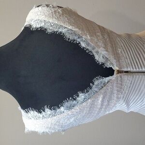 NWT Marchesa Notte off white striped mesh over lace high low hem dress