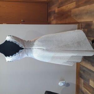 high low hem with peekaboo floral lace and lace overlay bodice lined new with tags excellent condition no issues fringe lace at neckline. mesh overlay is a striped pattern halter style top a stunning gown dress pictures cannot do this expensive designer gown justice. size 6