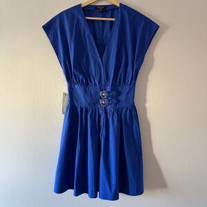This Marciano by GUESS dress is a bold and structured piece crafted from 100% cotton, offering breathability with a polished edge. The vibrant cobalt blue hue makes a striking statement, while the crisp cotton fabric adds texture and body. It features a plunging V-neckline, cap sleeves, and a cinched waist with a wide waistband accented by two silver-tone buckle straps for a modern, tailored look. The skirt flares gently into an A-line silhouette, making it both flattering and comfortable. Perfect for warm-weather outings or dressier daytime occasions, this dress blends clean lines with effortless confidence.