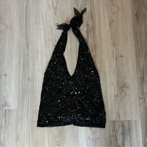 NWT new with tags Marciano brand black sequinned v neck tie back halter top sz L. Beautiful stretchy mesh fabric layered adorned with black beading and sequins. Not available in stores as this was purchased many years ago. Perfect