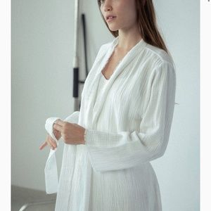 This soft organic cotton gauze robe has a raw-edge detail along the neckband and hems. Front opening and slightly oversized, it can be adjusted to your fit. Comfortable side seam pockets and a separate tie.