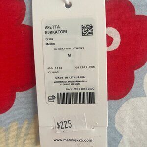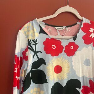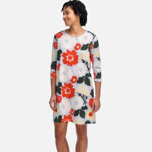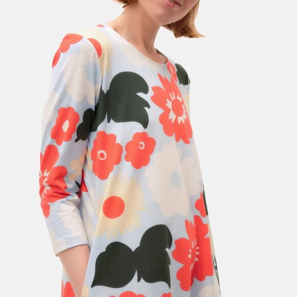 The Aretta dress is made of cotton jersey in the Kukkatori pattern. The dress has cropped sleeves and side seam pockets. The A-line dress has a slim fit.