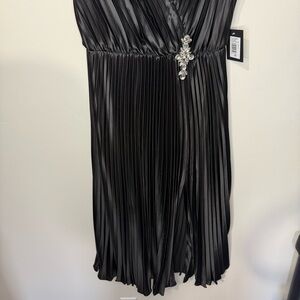 Features: Charmeuse V-Neck Sleeveless Pleated A-Line Dress, black satin, leg slit, rhinestone waist buckle, v neckline, midi length.