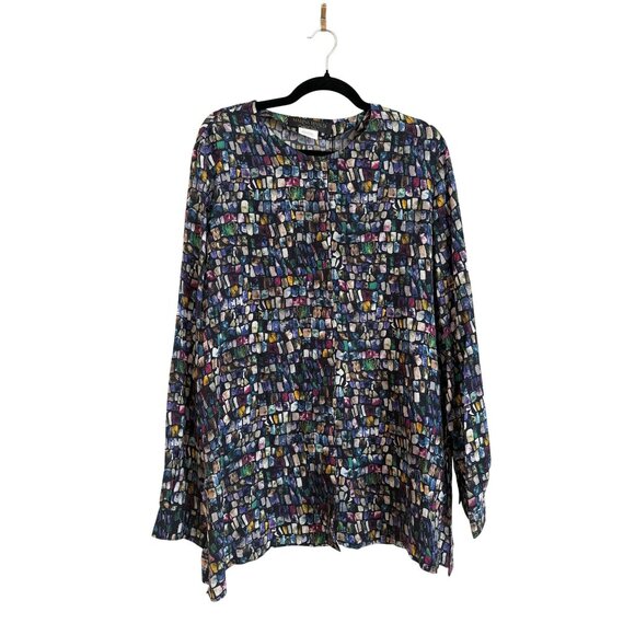 Elegant and vibrant, this NWT Marina Rinaldi Balocco top is crafted from luxurious silk, offering a sophisticated touch to your wardrobe. Perfect for any occasion, it features a stunning multicolor design that ensures you'll stand out in style. Button down closure with hidden buttons, color in the tag is "china blue" but this is multicolor jewel tones. MSRP $575