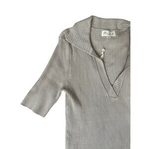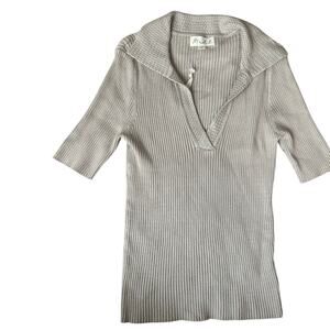 Elevate your style with this brand new, never-worn grey ribbed knit short sleeve polo! This chic and comfortable top is perfect for adding a touch of sophistication to any outfit. Don't miss out, grab it now!