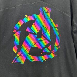A bright rainbow-shattered Avengers graphic updates a soft hoodie styled with a button placket and raglan sleeves.