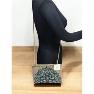 This New With Tags Mary Frances Fanfare Beaded Bag from 2024 is just gorgeous! Featuring an envelope style bag with a hand beaded design of Peacock feathers in gold and teal with a stone center, this bag is both stunning and functional with a removable chain strap for clutch or shoulder/cross body wear. The perfect bag for an evening out or special event!