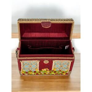Exterior – Hand beading, antique brass hardware, vegan leather padded and chain removable handle, protective feet and back magnetic snap closure. Includes a MF emblem tag, dust bag and certificate of authenticity.