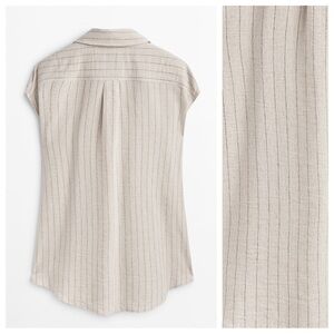 NWT. Massimo Dutti Beige Pinstriped Pajama-Style Waistcoat/Blouse. Crossover closing with a bow tie. Pinstriped. Made of cotton and linen. Side vents at the hem. Short sleeves. Size S. Ref. 6002/530. Pit to pit 21,5" flat, shoulders 21", length 29". MD