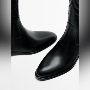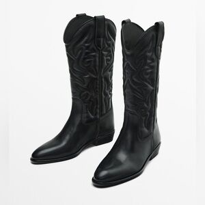 NWT. Massimo Dutti Black Leather Embroidered Cowboy Boots. Detail of engraved cane. Leather lining. Leg height: 33 cm. Leg height: 35 cm. Heel: 3cm. Includes AIRFIT® insole: Flexible technical foam insole, designed to offer greater comfort. Size 8. Ref. 1058/250.