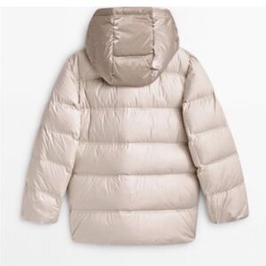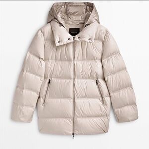 NWT. Massimo Dutti Cream Quilted Puffer Jacket with topstitching and hood, a slim fit, high neck, front zipper closure, two side pockets, long sleeves. Size S. Ref. 6737/820. Pit to pit 22,5" flat, shoulders 17", sleeves 24", length 29".