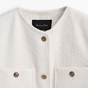 NWT. Massimo Dutti Cream Wool Blend Textured Elegant Cropped Jacket with Gold-Toned Buttons. Crew neck. Button fastening. Two patch pockets. Lined sleeves. Size M, L. Ref. 6049/558. Size M - Pit to pit 21" flat, shoulders 15", sleeves 23", length 22". Size M - Pit to pit 22" flat, shoulders 16,5", sleeves 23,5", length 22,5". BS1