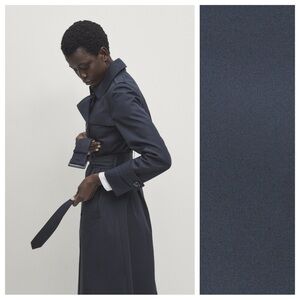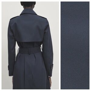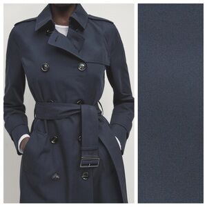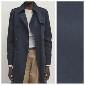 NWT. Massimo Dutti Navy Blue 100% Cotton Long Trench Coat with Belt. Size S.