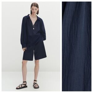 NWT. Massimo Dutti Navy Blue Cotton Voile Blouse with Gathered Details. Size XS.
